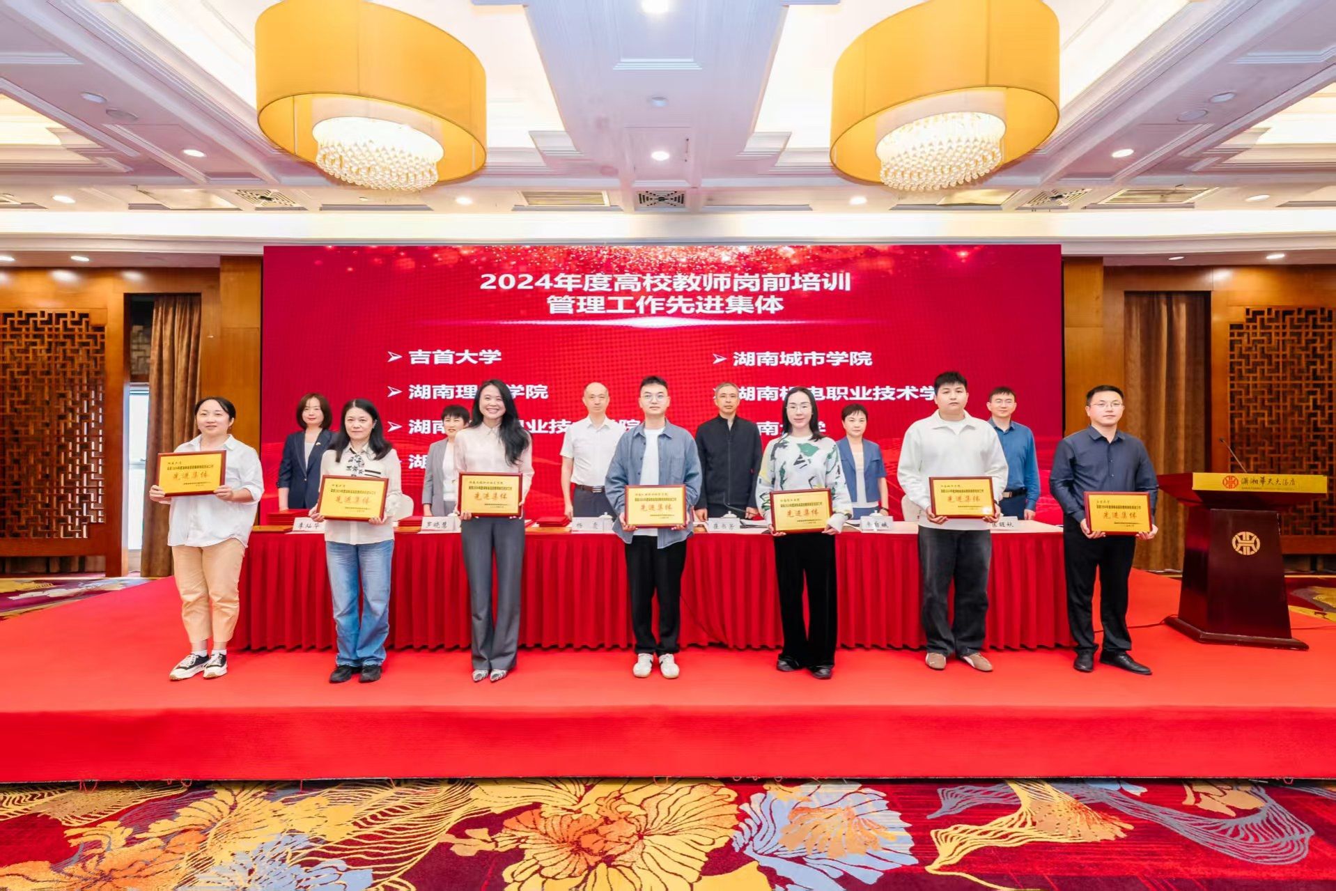 杨震宣读《关于表彰2024年度湖南省高等学校教师岗前培训先进集体、先进管理工作者和优秀学员的决定》,并与主席台就座的领导为获奖集体与个人颁奖。